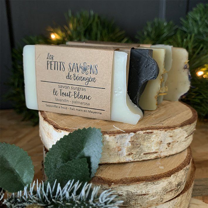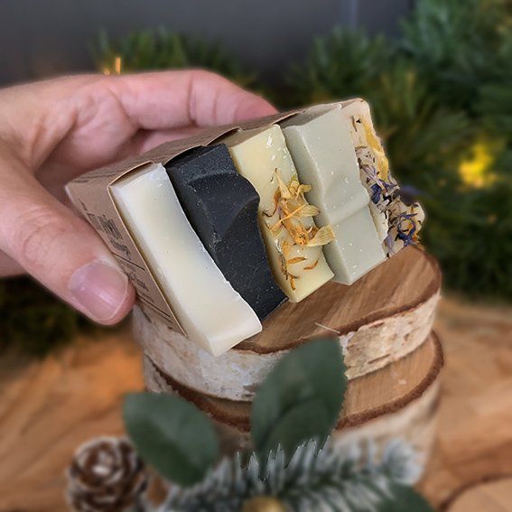 Ce coffret zéro-déchet est composé de 5 savons au format «invité» (25g par savon), dans un sachet réutilisable en coton. L'étiquette Joyeux Noël est incluse.