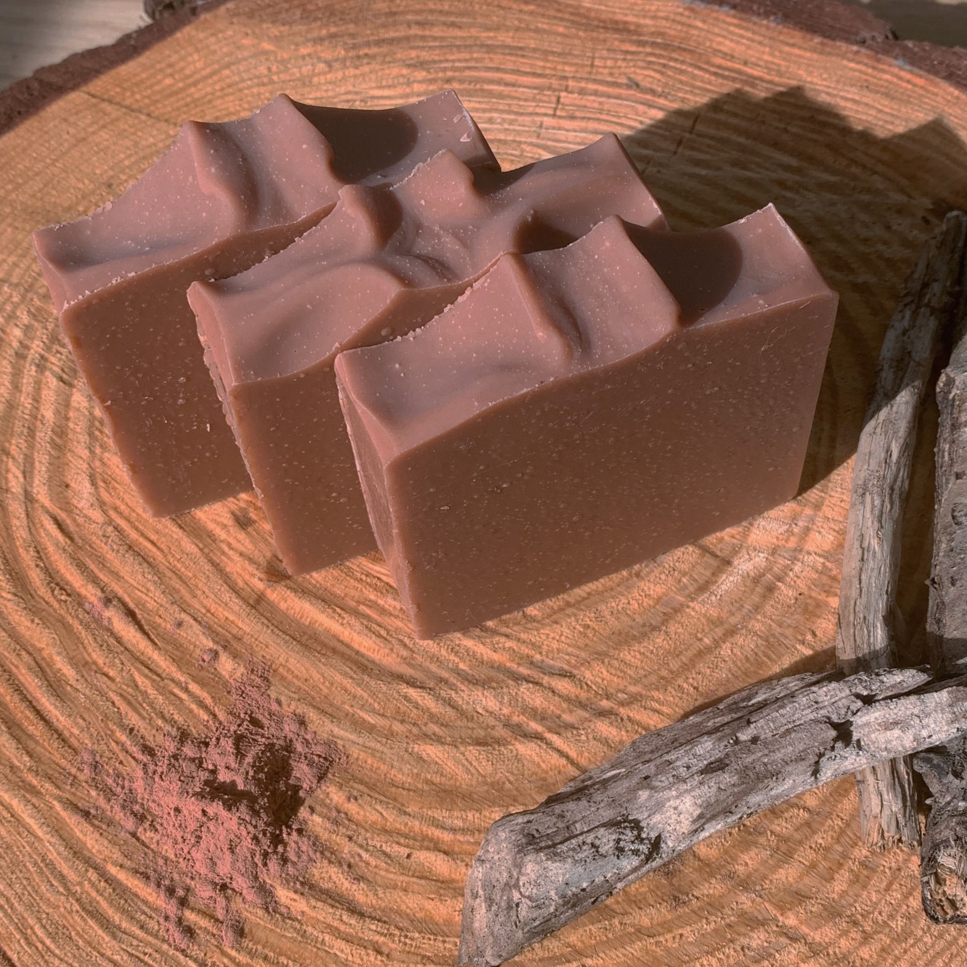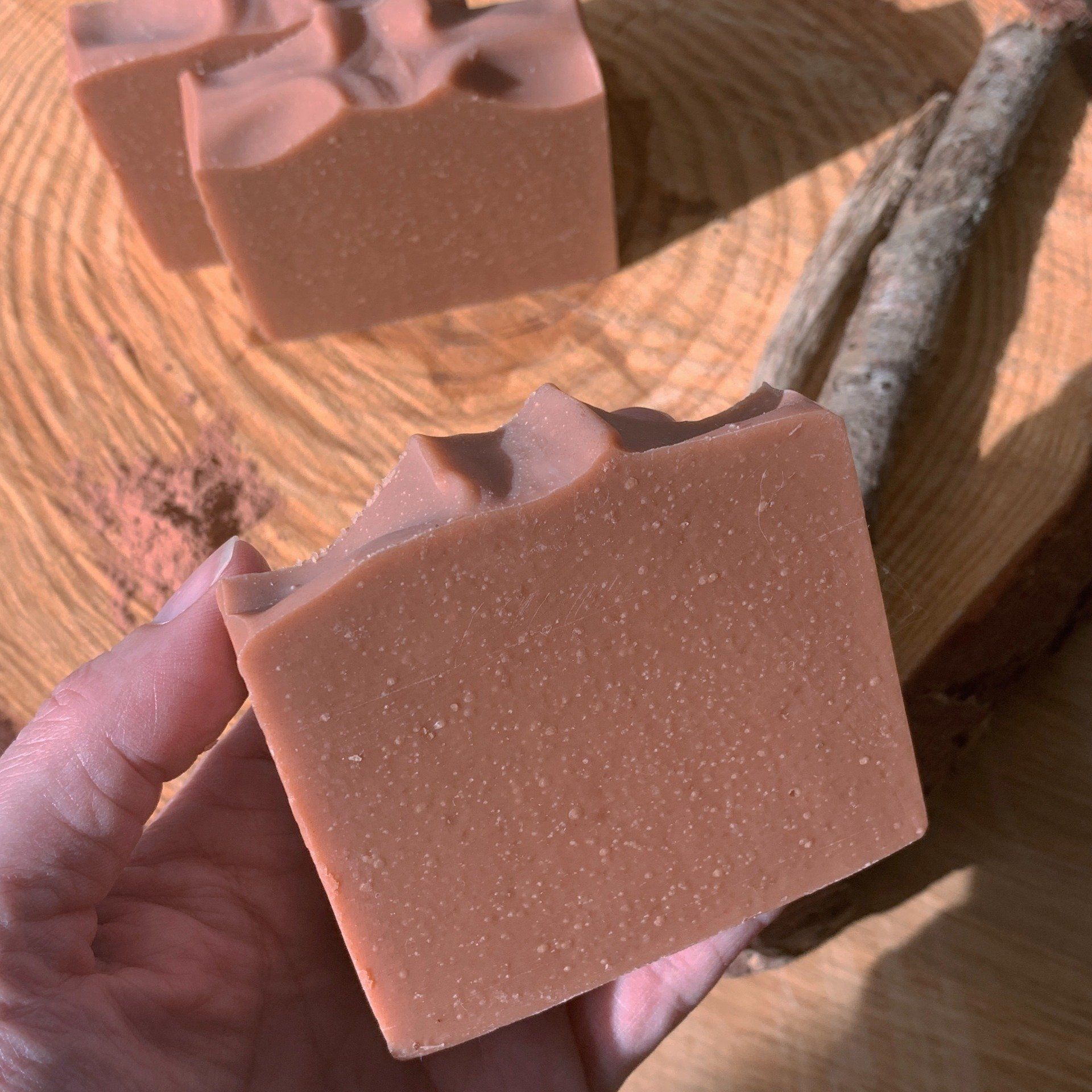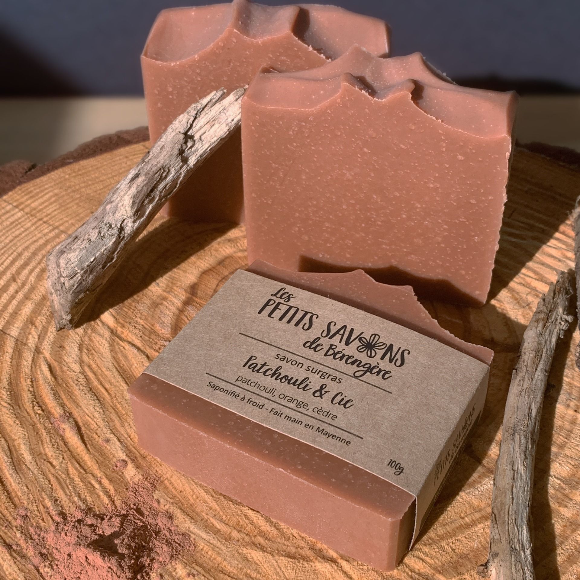 Savon surgras à l'argile rouge, parfum patchouli, cèdre et orange douce.